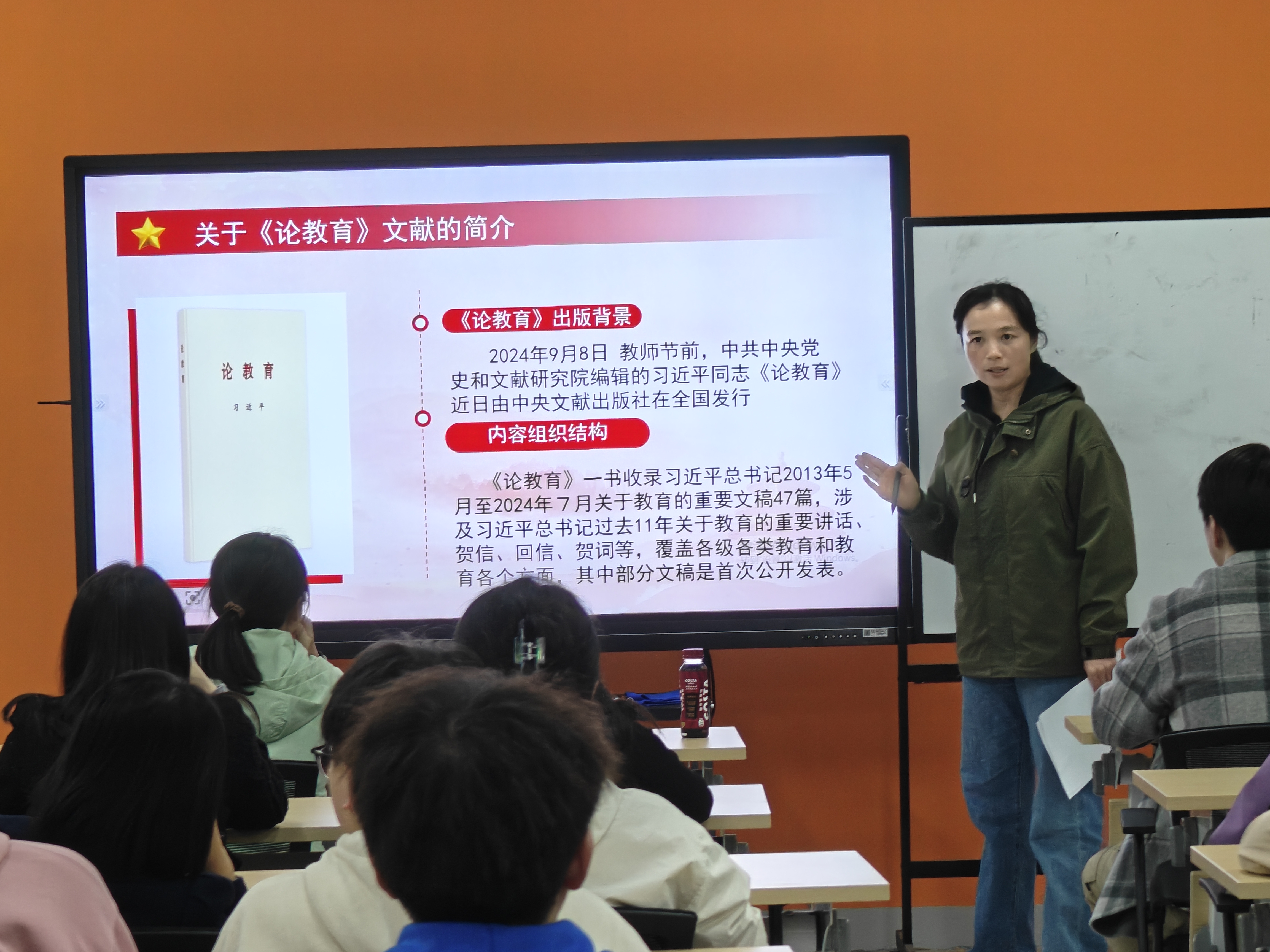 党总支书记田晋首先讲到《论教育》是 2024 年 9 月中央文献出版社出版的专题文集,由中共中央党史和文献研究院编辑。它集中展现了党的十八大以来习近平同志围绕教育发表的一系列重要论述,这些论述科学回答了教育的根本问题,深化了对我国教育事业的规律性认识,对于新时代新征程办好人民满意的教育具有重大指导意义。随后讲到系列重要讲话的内在逻辑等方面,她强调我们要遵循教育规律与改革创新的有机统一,既强调要遵循教育规律,扎根中国大地办教育,又注重教育改革创新,以适应时代发展的新要求。在教育教学方法、教育评价体系、教育管理体制等方面不断推进改革,激发教育发展活力,提高教育质量和效益,推动教育事业不断迈上新台阶。