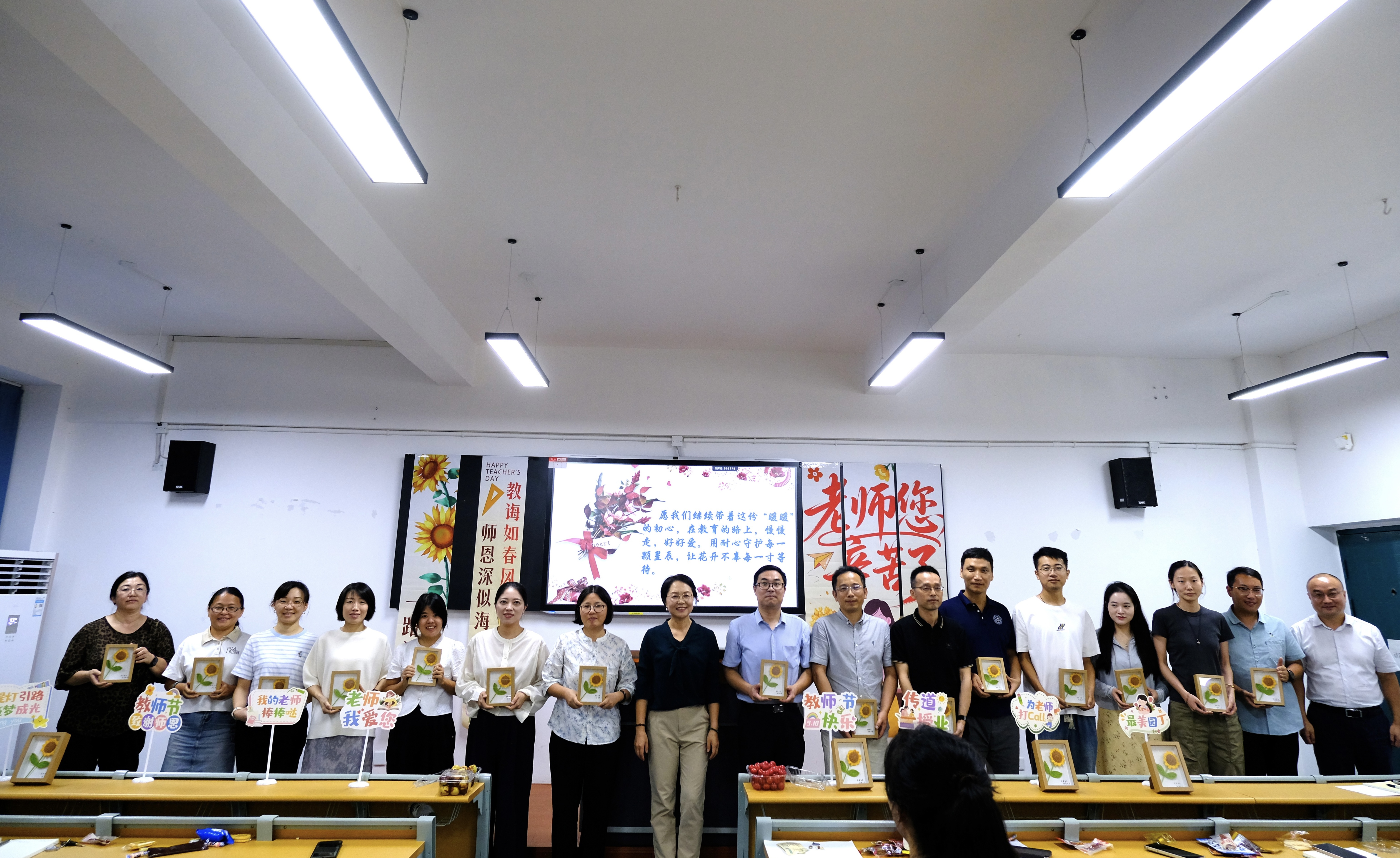 随后,刘院长为老师们送上温情致辞与节日祝福。他寄语全体教师:“愿大家始终怀揣这份‘暖暖’的教育初心,在育人征途上稳步前行、深耕热爱。以耐心守护每一颗‘星辰’般的学子,让每一份成长都不负时光的等待,让教育的温度照亮学生的未来。” 致辞结束后,刘院长与黄院长共同为教师代表送上节日礼物 —— 这份礼物由学生们亲手筹备,扉页上满是手写的真挚寄语,或诉说课堂上的成长感悟,或表达对恩师的感恩之情,纸短情长间,浓浓师生情谊跃然纸上。